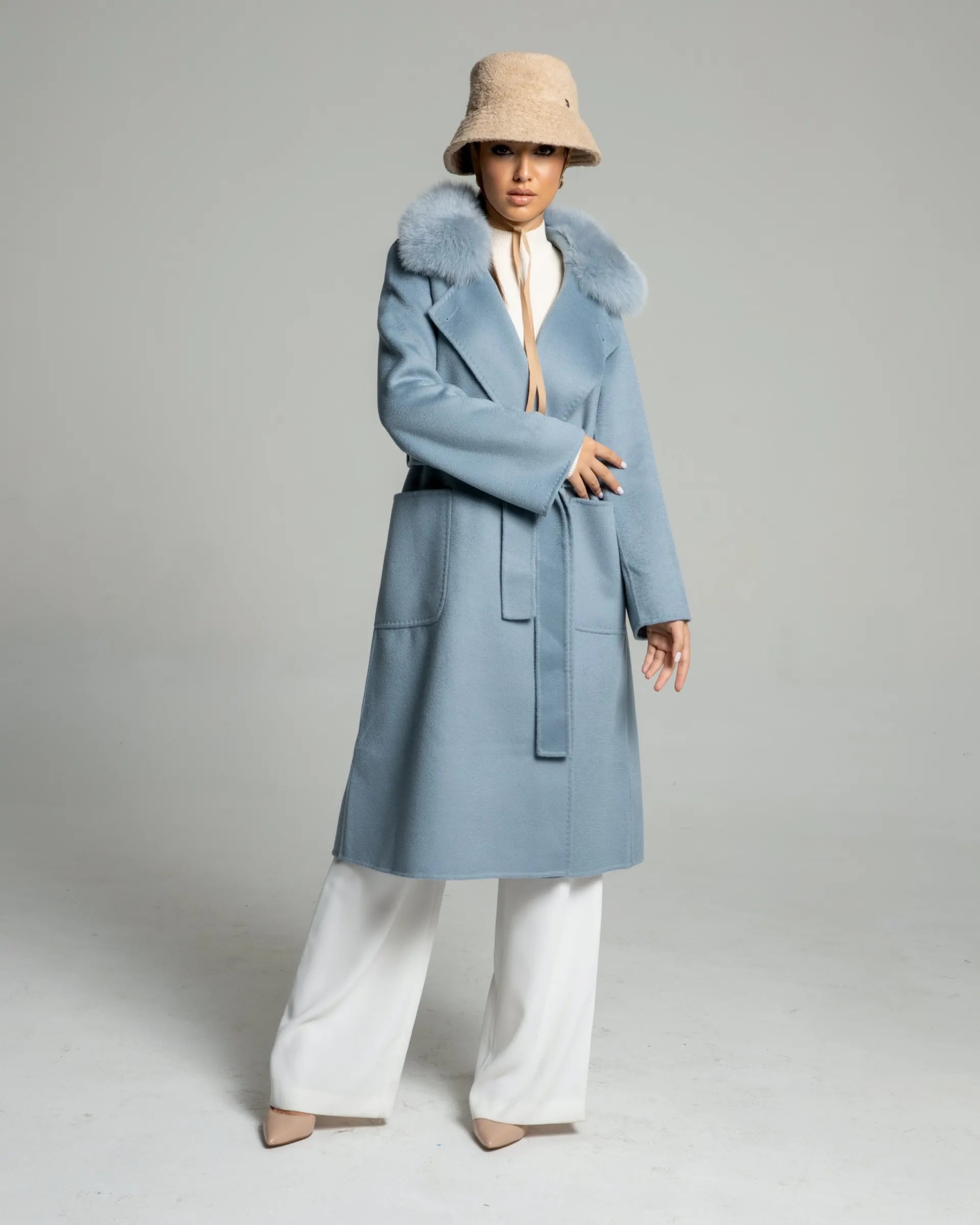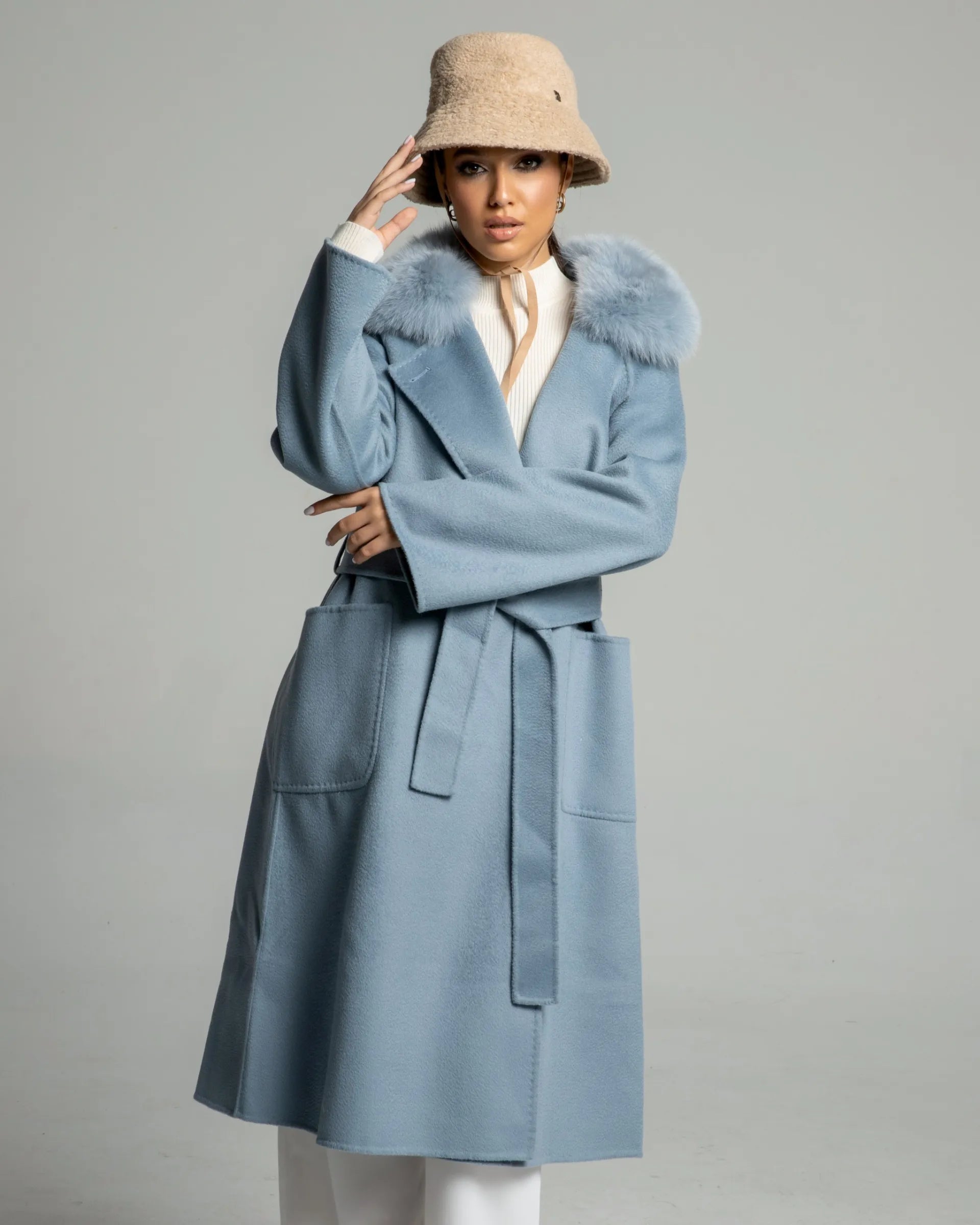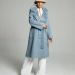 The CHARLOTTE Wool Coat is made from unique water ripple wool and features a detachable fox fur collar. Its standout baby blue color adds a soft, delicate look to this oversized coat, making it perfect for various styling options, including bold outfits. The versatile color pairs well with simple pieces, adding a striking touch to any ensemble. The CHARLOTTE Wool Coat combines elegance and comfort, making it a must-have for any wardrobe.