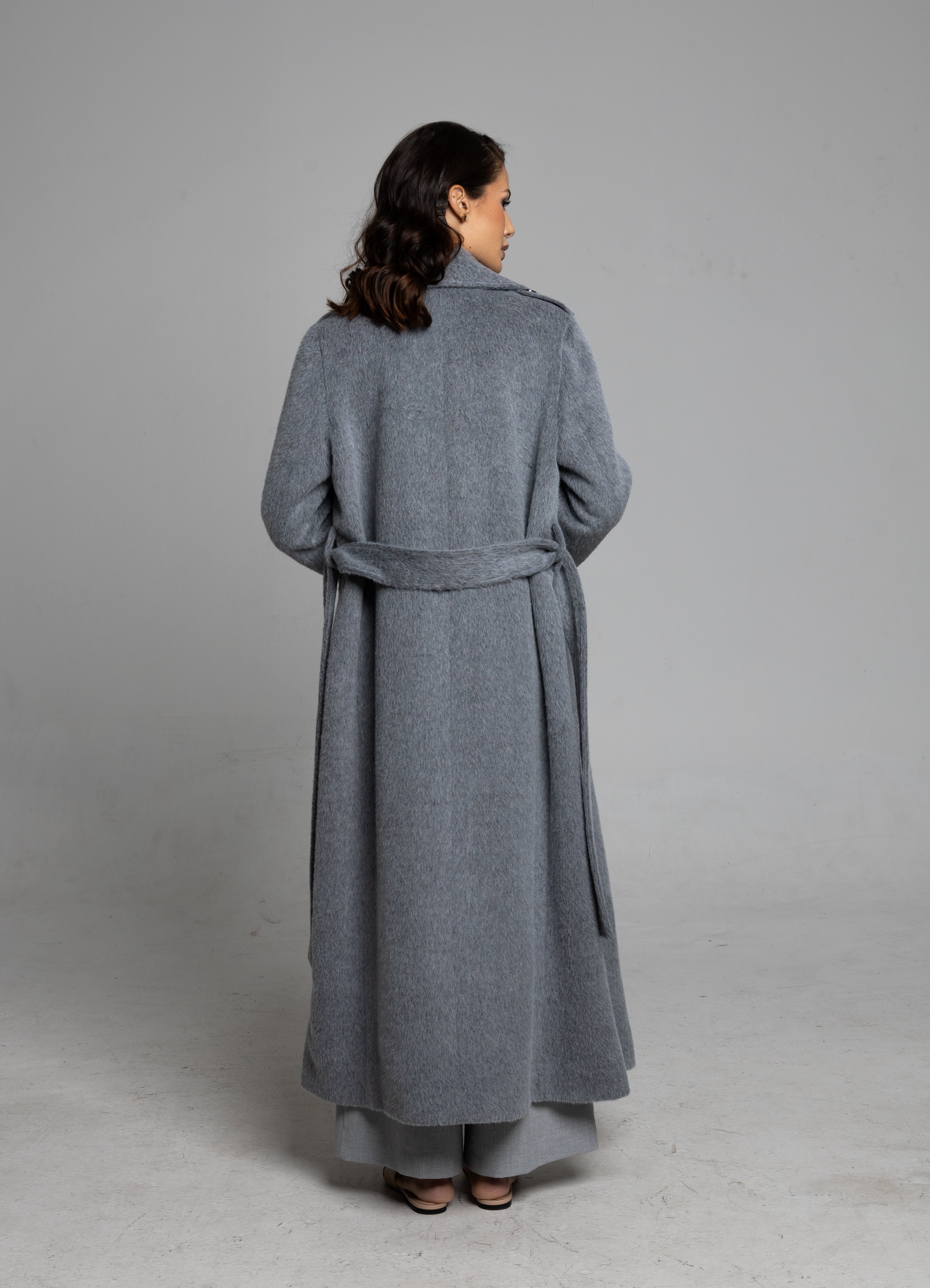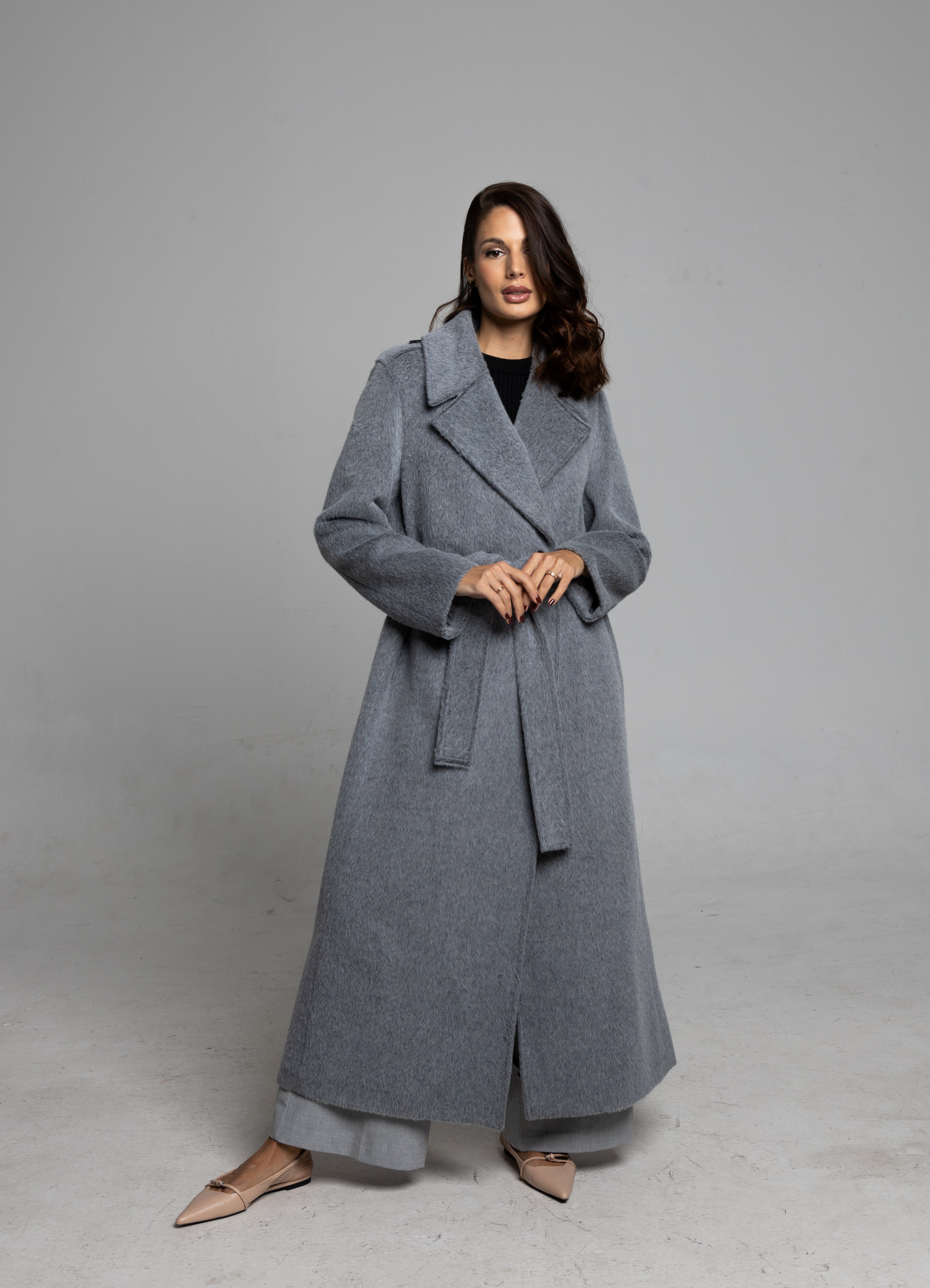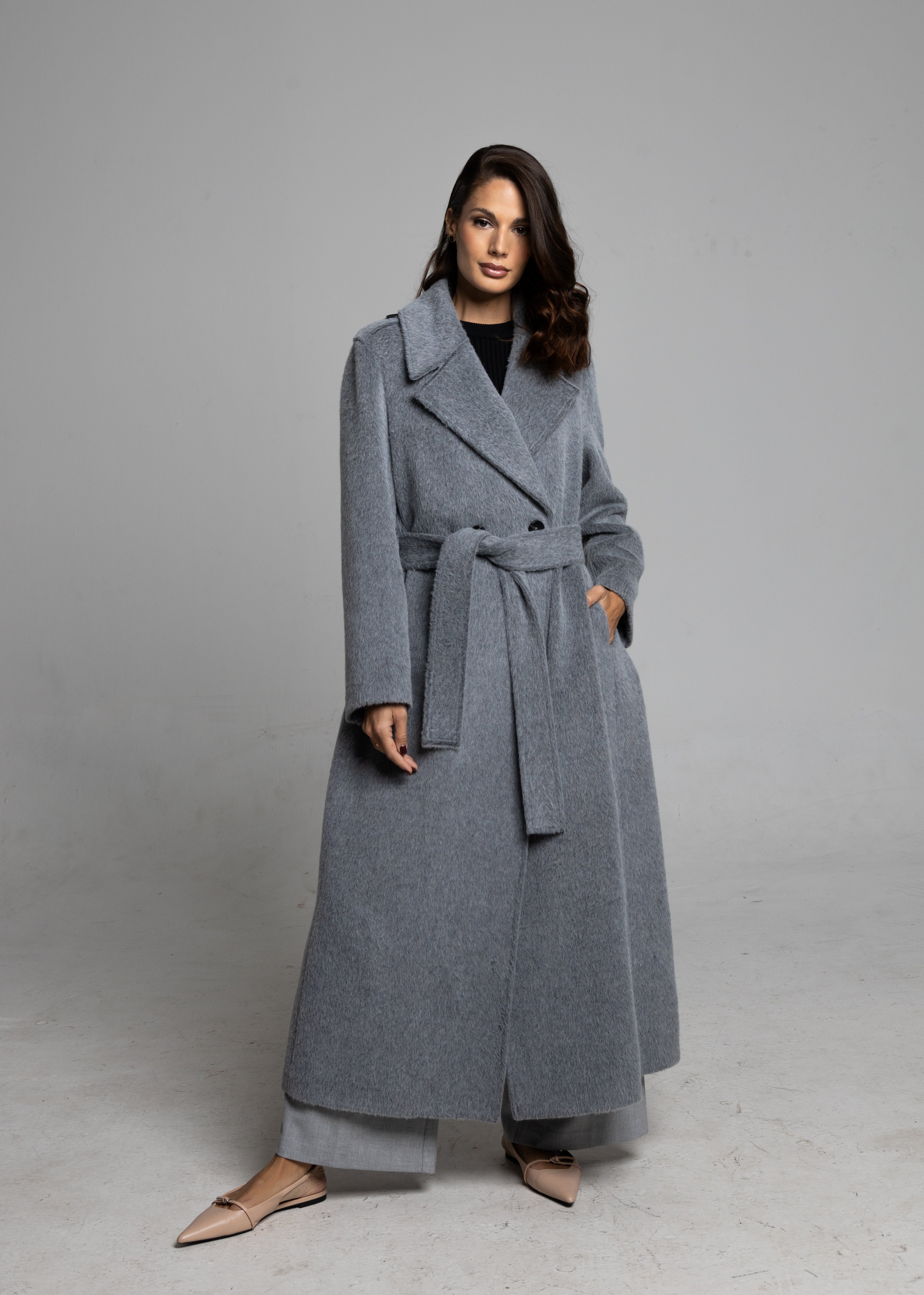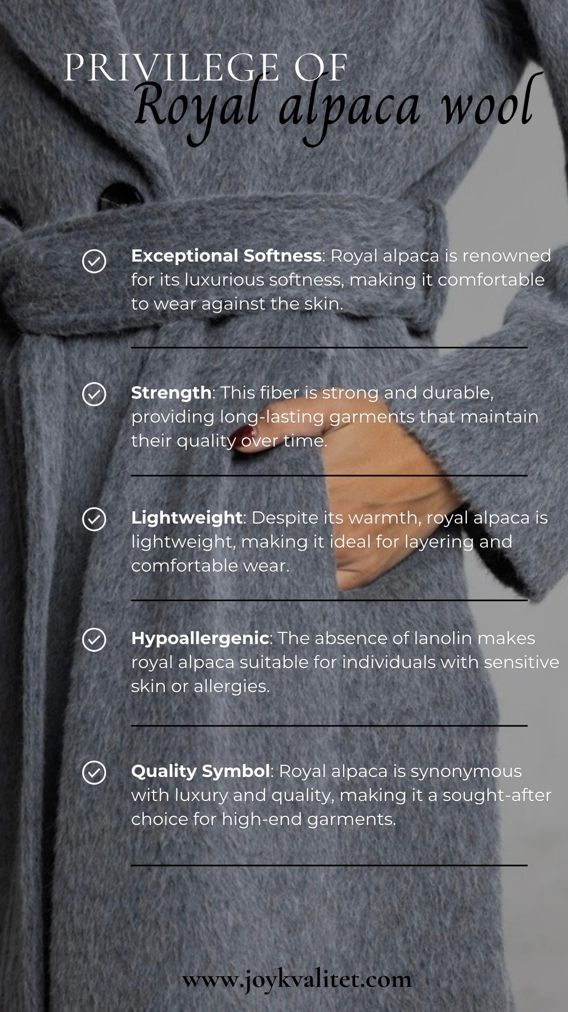 The JOY royal alpaca wool coat exudes elegance and exclusivity, showcasing the refined qualities of this extraordinary material. Renowned for its lightweight warmth, softness, and durability, alpaca is a luxurious choice that provides exceptional comfort and sophistication. The coat’s perfectly tailored shoulders enhance its silhouette, offering a flattering and polished look. Its versatile gray hue pairs effortlessly with any color, making it easy to style for any occasion. Elevate your wardrobe with this timeless piece, embodying a perfect blend of luxury and practicality.