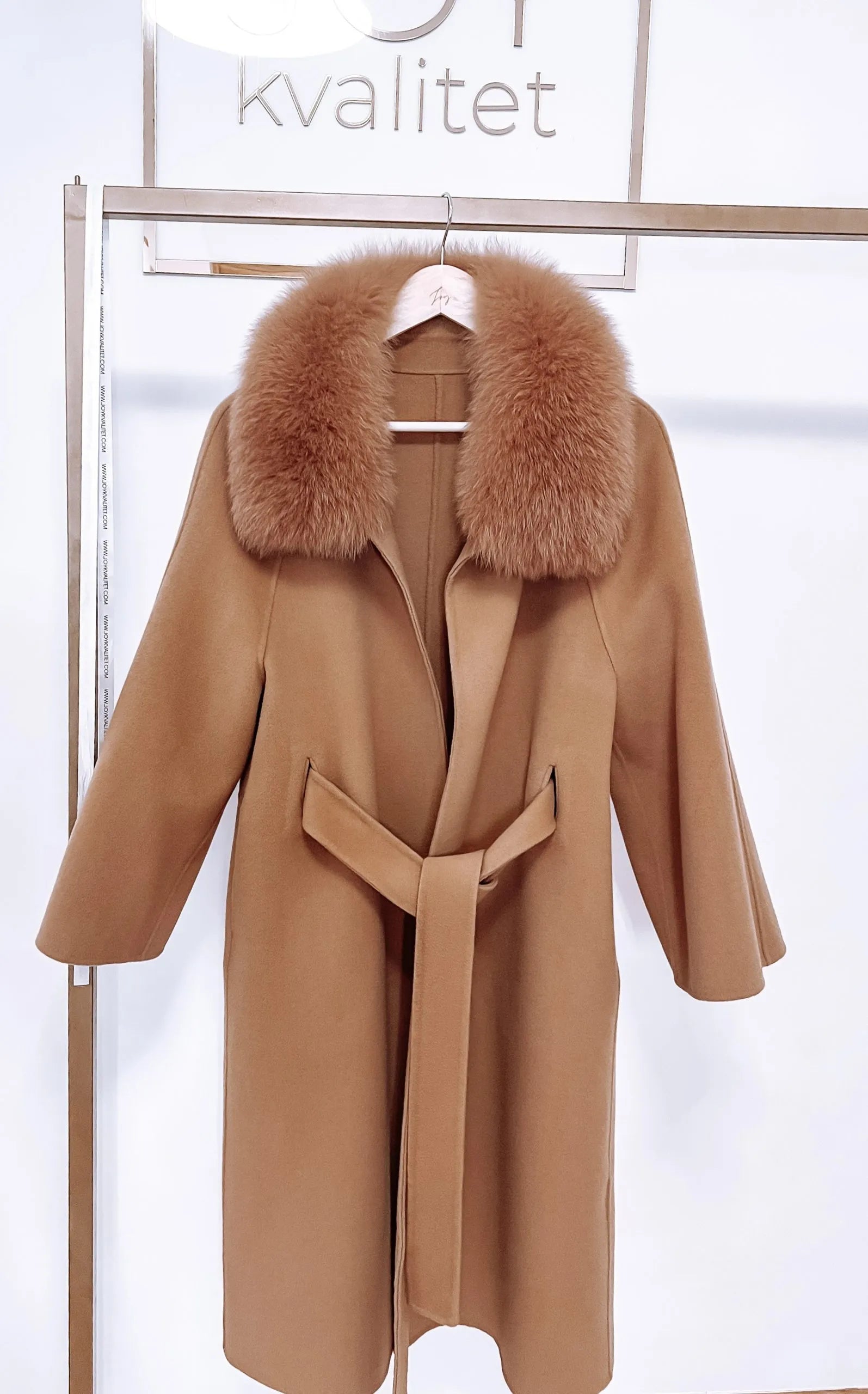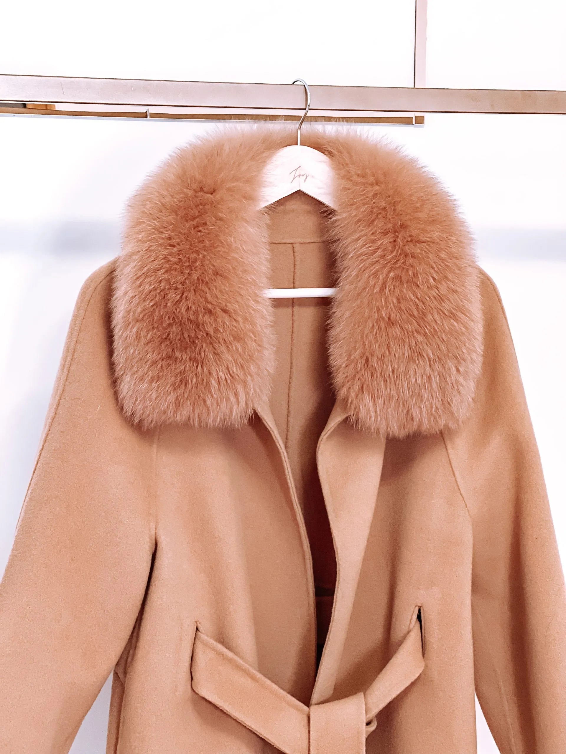 Details: finest fox fur collar, semi – hidden belt